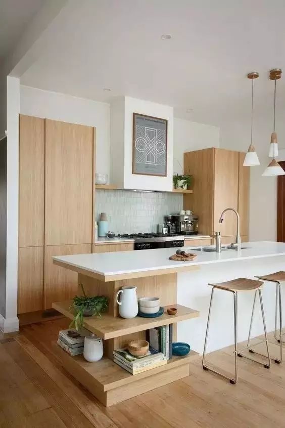 2.利用拐角布置就餐区,靠墙设置一个实用的餐边架,可以将餐具等物品放置在上面,既美观又方便取用而且还减少了厨房的收纳压力。